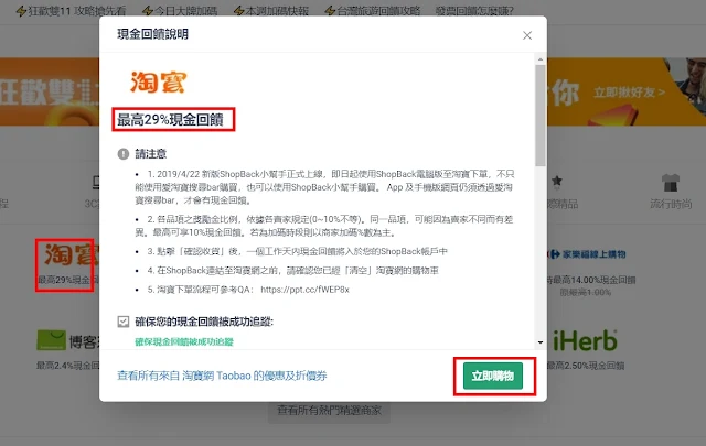 下單前可至 Shopback 找尋想下單的商家,以淘寶為例,點選淘寶後,可查詢回饋比例和注意事項,接著按立即購物,就可連結到淘寶的網站下單。